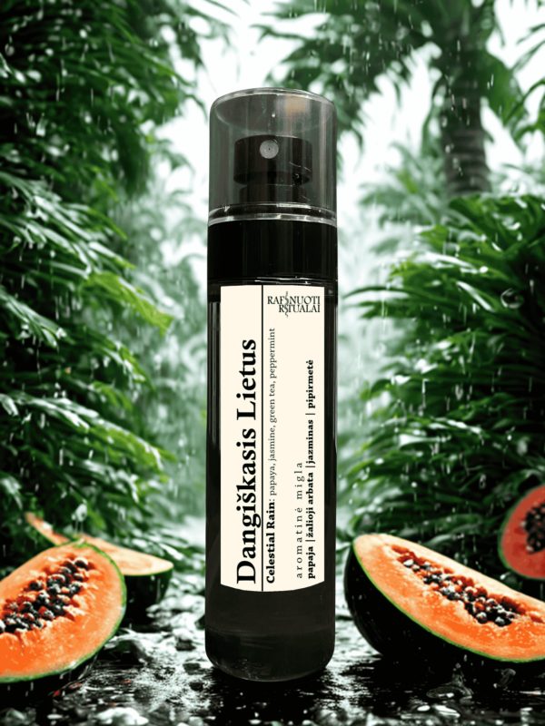 Patirkite kvapų magiją – jūsų ramybės oazė yra vos vieno purškimo atstumu. Dangiškasis Lietus suteikia gaivų ir pakylėjantį pojūtį, primenantį lietaus tyrumą, susiliejusį su gamtos gyvybingumu. Ryškios greipfrutų ir papajos citrusinės natos pažadina pojūčius, o pipirmėtė suteikia vėsų ir gaivinantį akcentą. Širdyje jazminas ir žalioji arbata atneša raminančią, dvasinę harmoniją, subalansuotą pačiulio šilumos. Šis kvapas įkūnija atsinaujinimą, paversdamas jūsų erdvę gaivumo ir ramybės prieglobsčiu. Pagaminta rankomis, mažomis partijomis.